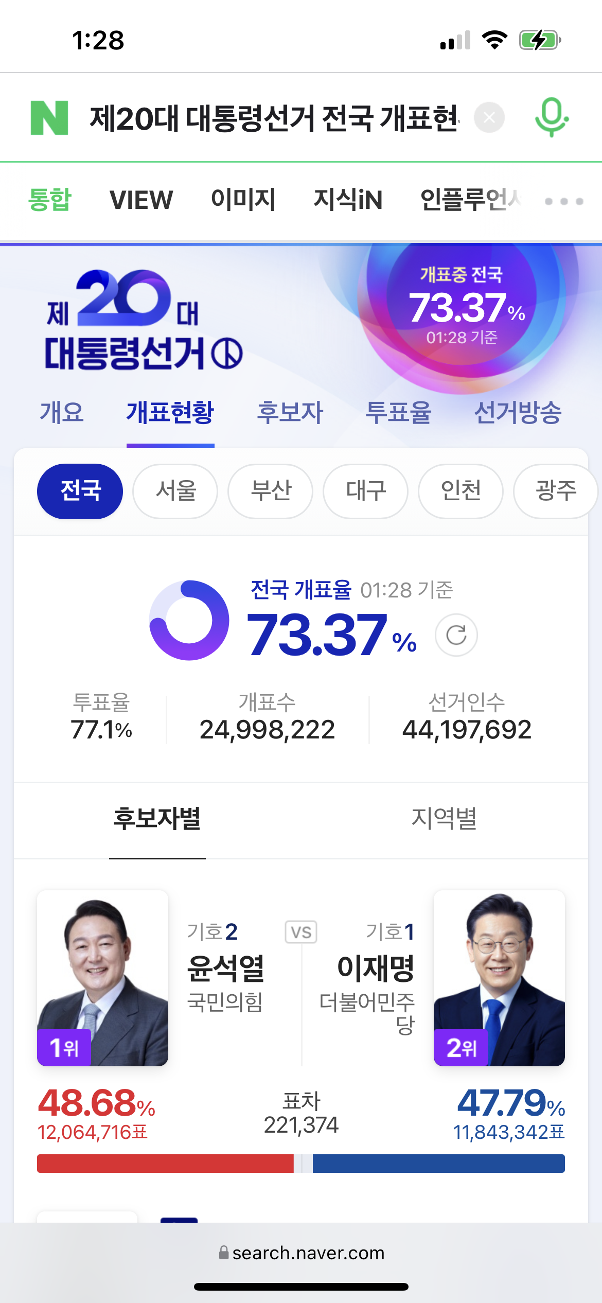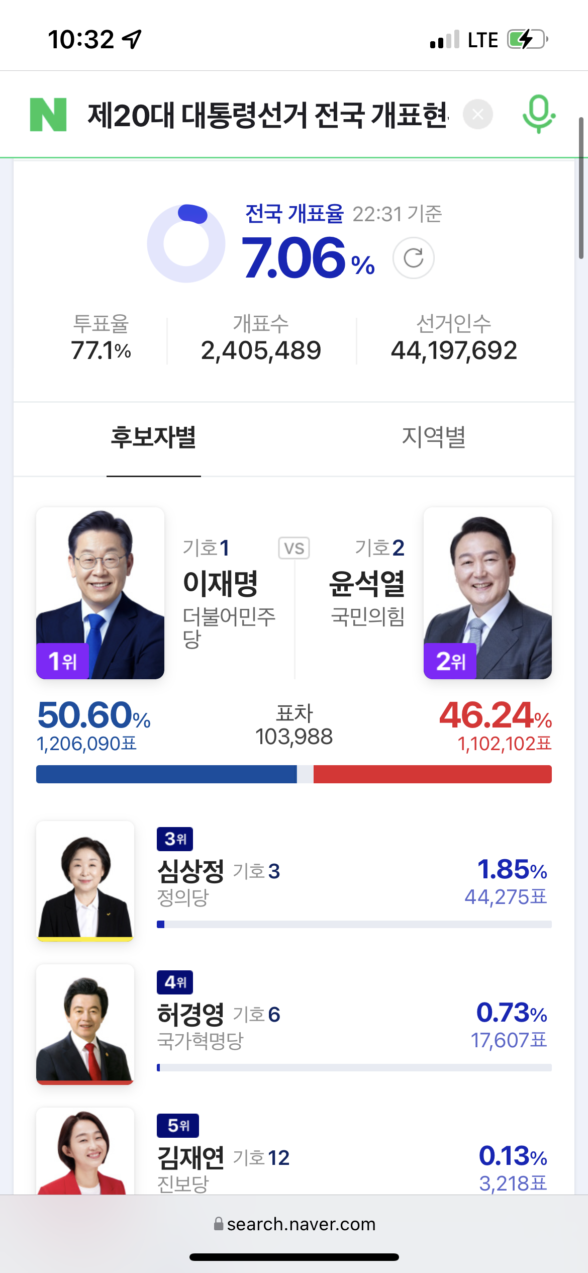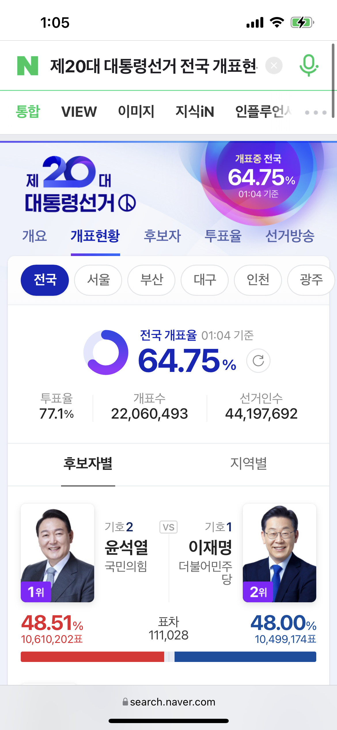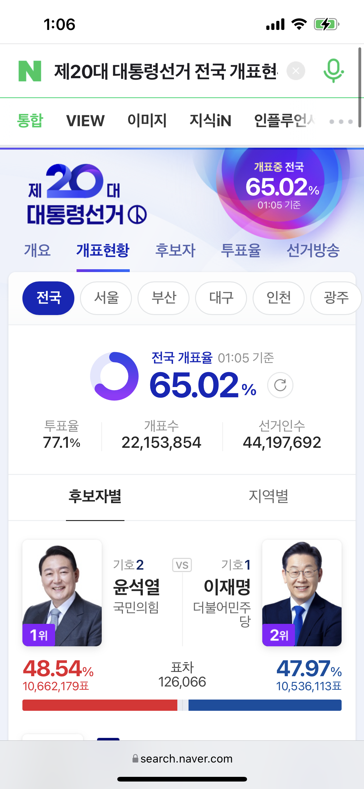 그리고 개표가 진행되면서 조금씩 윤석열 후보가 따라잡기 시작합니다. 이때가 10시 25분대였네요.