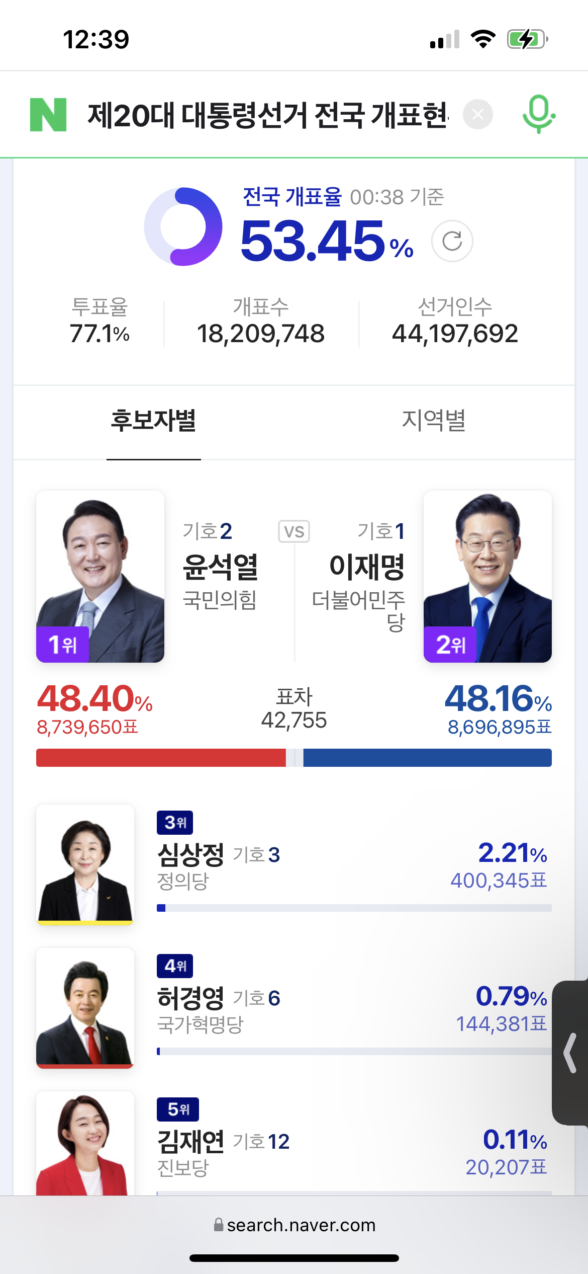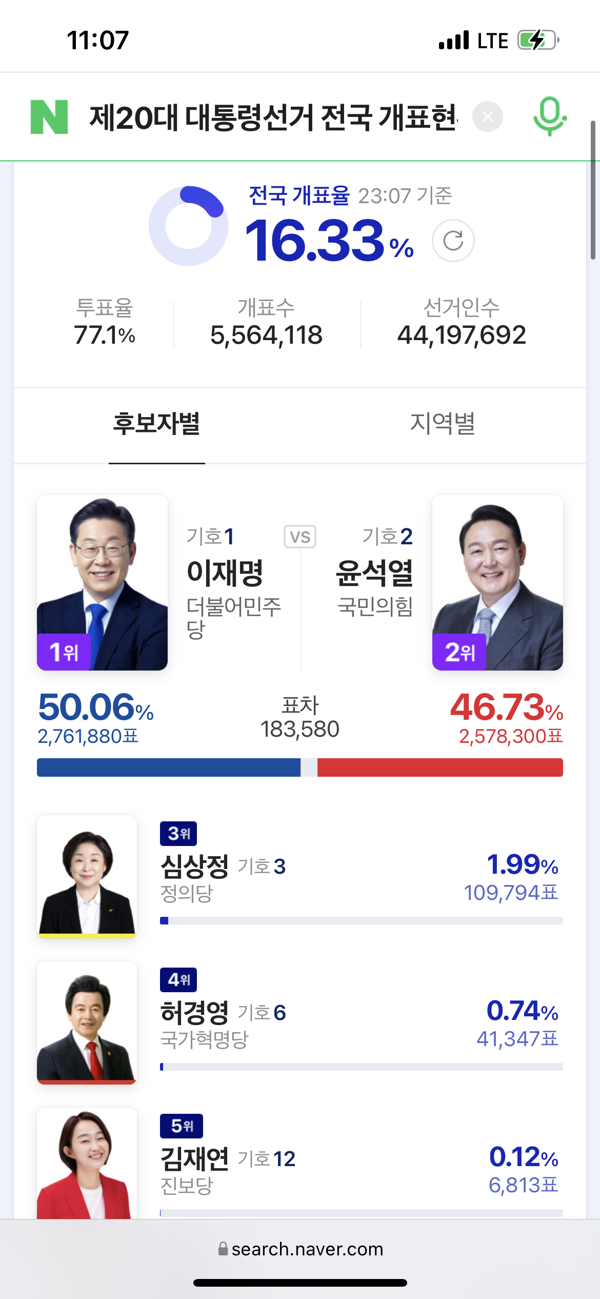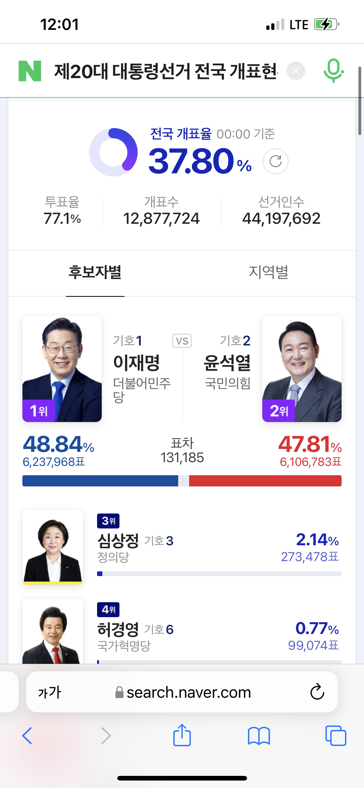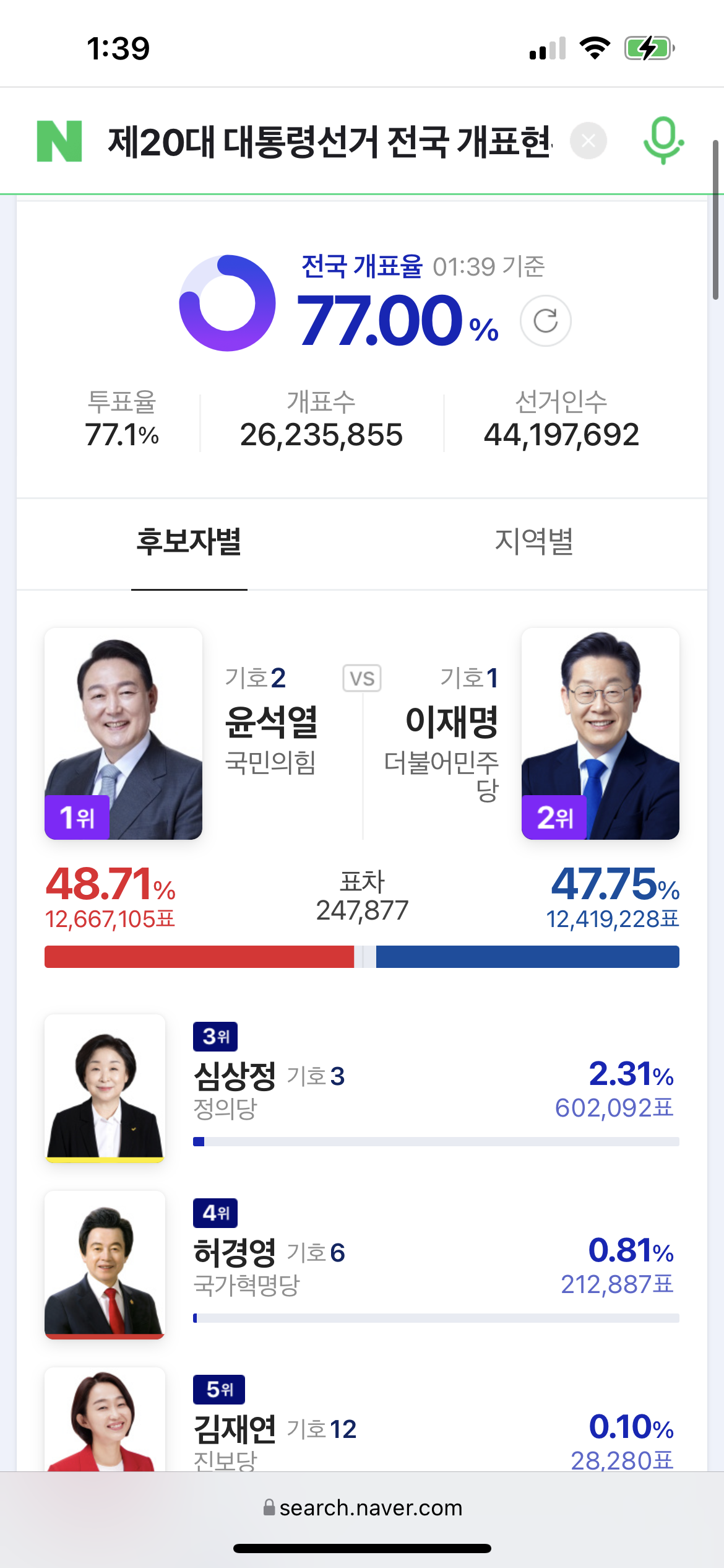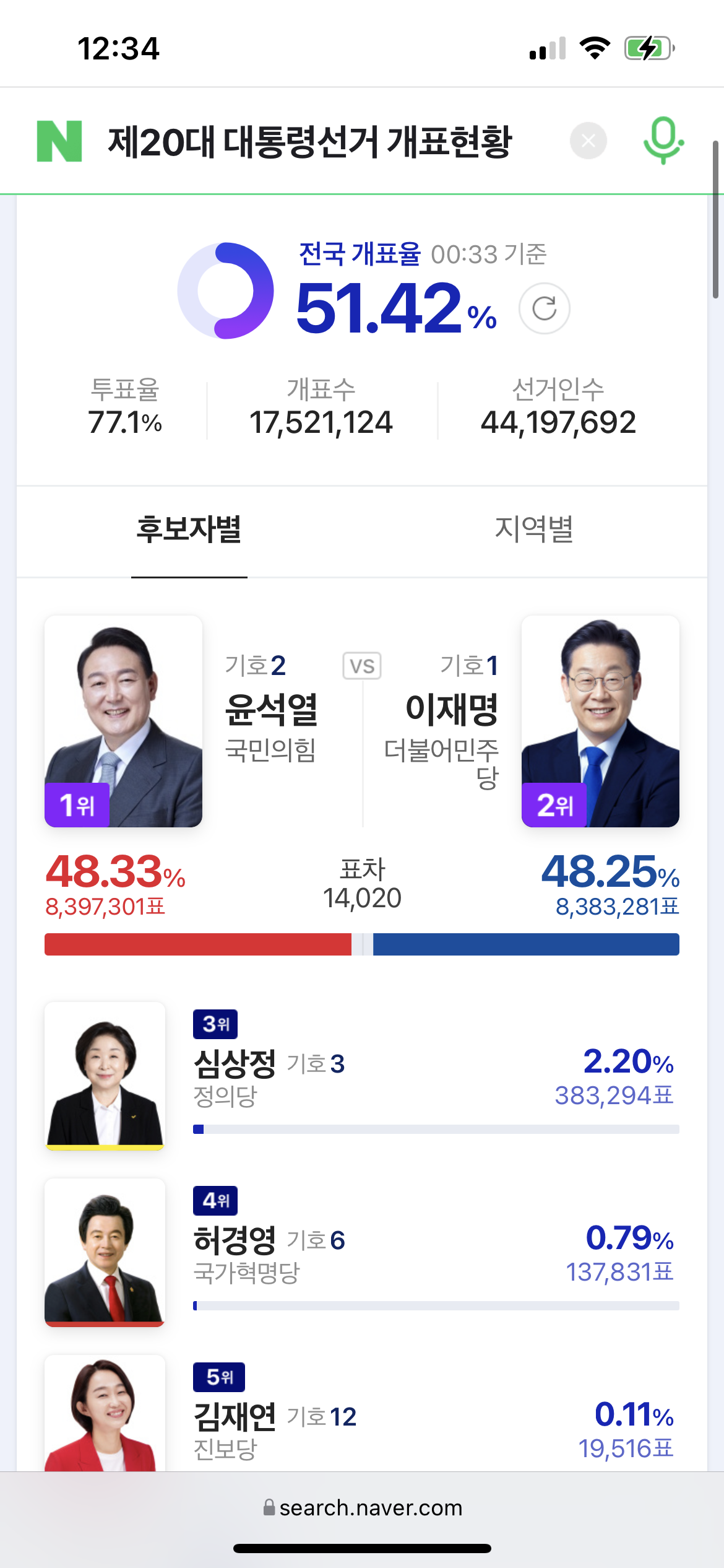 그리고 개표가 진행되면서 조금씩 윤석열 후보가 따라잡기 시작합니다. 이때가 10시 25분대였네요.