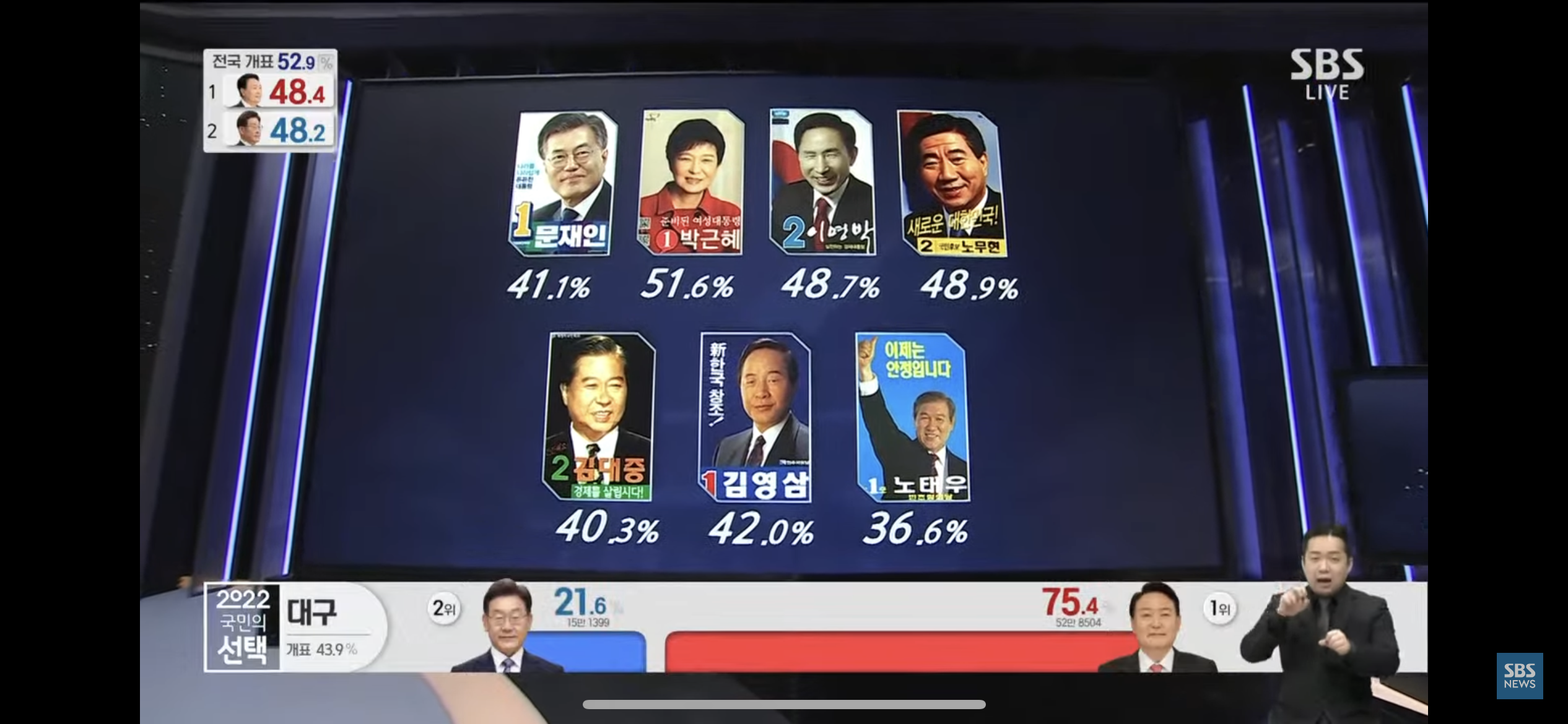 지인과 이야기하며 전했던 이야기지만 제가 생각하는 매직넘버는 48이었습니다. 바로 개표율 48%를 기점으로 떨어지는 후보가 패배할 거란 의미였는데요 대충 여야를 제외한 나머지 정당에서 4%정도의 표를 가져갈 것이기 때문에 나머지 96%에서 더 많이 표를 가져가는 후보가 승리할 것이 뻔하기 때문에 절반인 48%를 기점으로 잡았습니다.