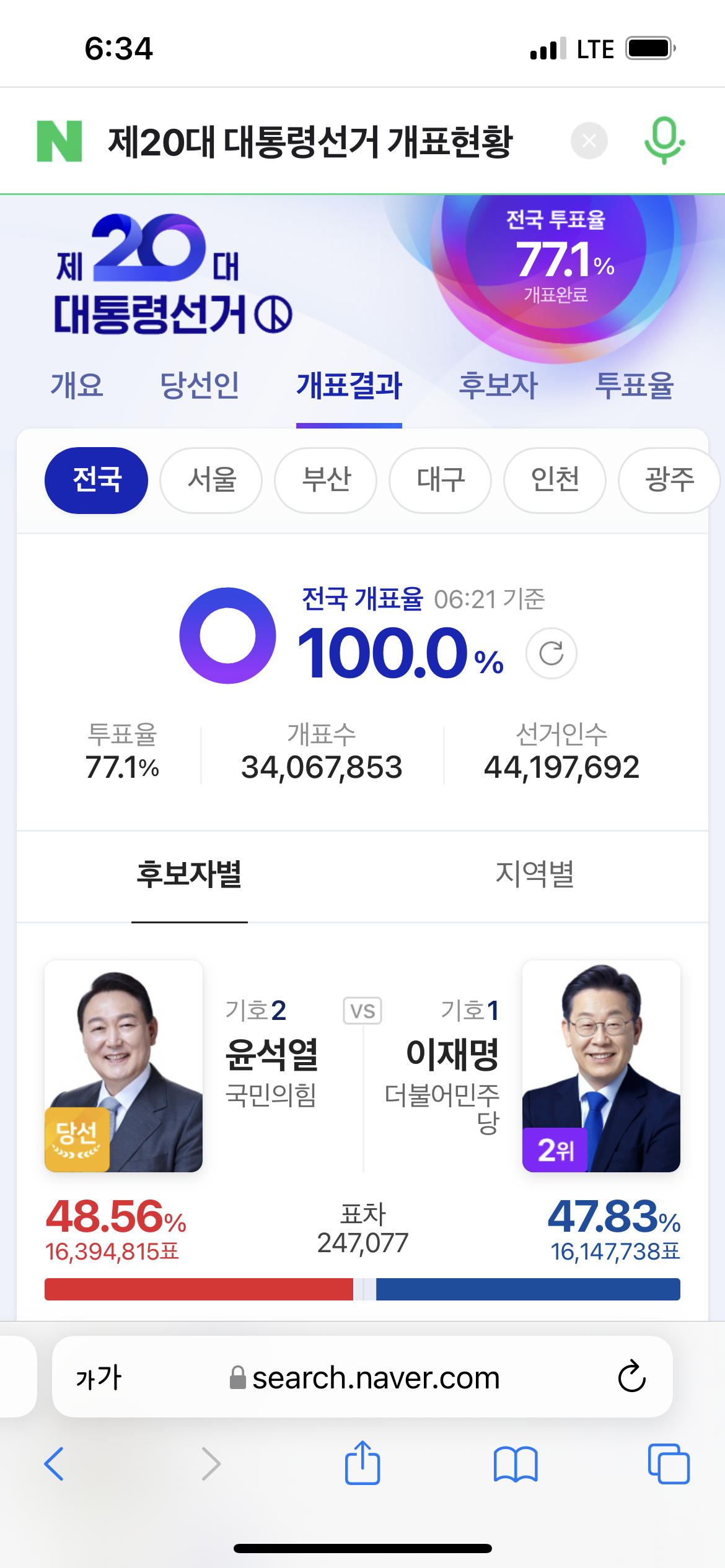 이후에는 특별히 치고나가는 흐름 없이 균형이 계속해서 이어져나갔고 결국 48.56% : 47.83%로 윤석열 후보의 승리로 마감합니다. 표차도 얼마 안나네요 제주도 절반수준? 이재명 후보는 지금까지 가장 많은 표를 득표하고 패한 후보가 되었다고 합니다.